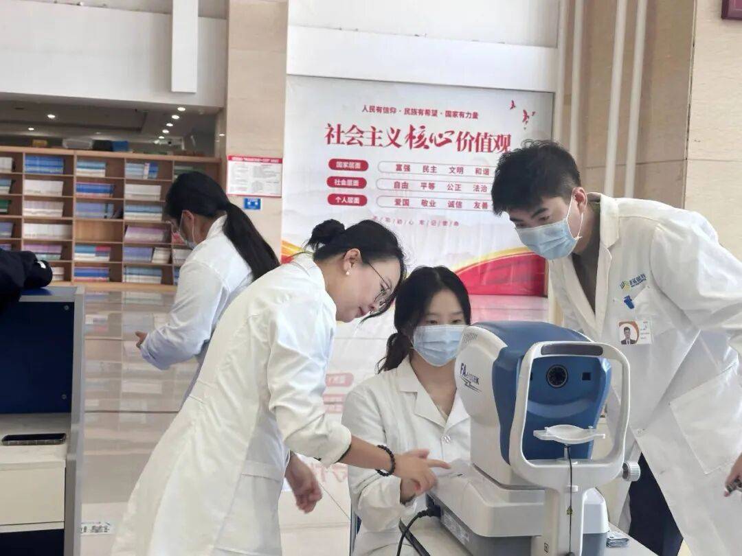 体检现场,普瑞眼科医院的医护人员与学院眼视光技术专业的师生组成专项检测小组,有序开展视力检查、电脑验光、眼表疾病筛查等多项检查项目。医护人员不仅细致记录每一位学生的眼健康数据,还针对部分学生存在的视力保护问题,现场讲解科学用眼知识、日常护眼技巧及视力矫正方案;学院学子则在实践中协助完成数据整理、检测引导等工作,既为同学提供了贴心服务,也将专业知识转化为实践能力,实现了“服务他人”与“自我提升”的双向赋能。
